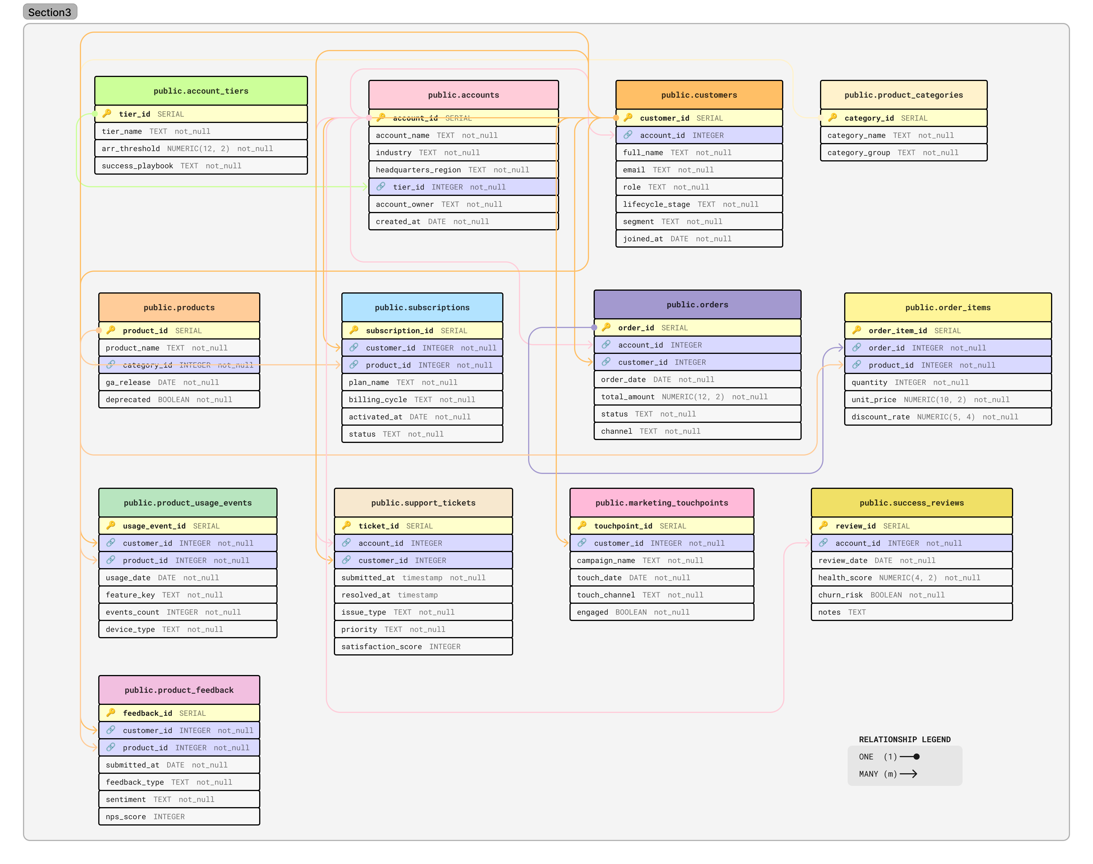 JOIN・CTE・サブクエリを活用し、顧客アカウントの健全性や行動を横断的に把握するSQL演習。複数テーブルを組み合わせたビジネス分析を学びます。